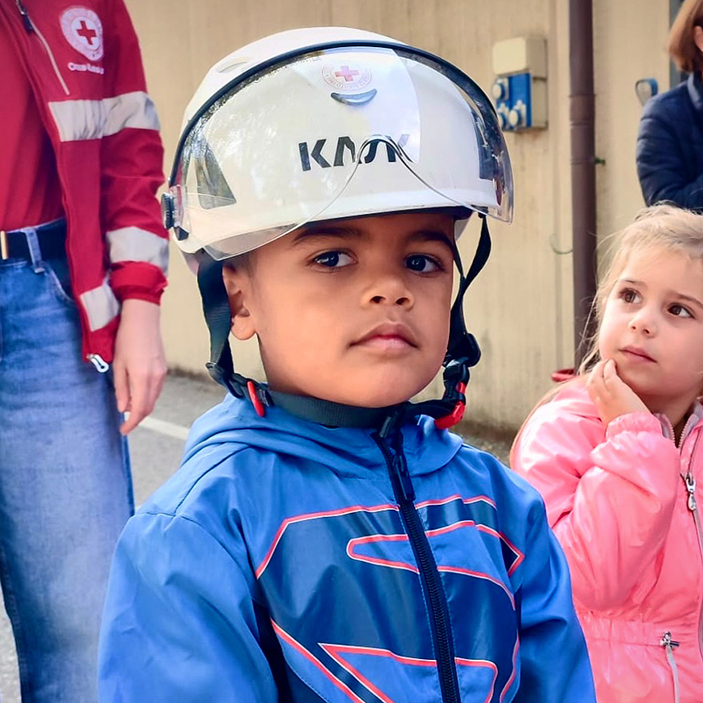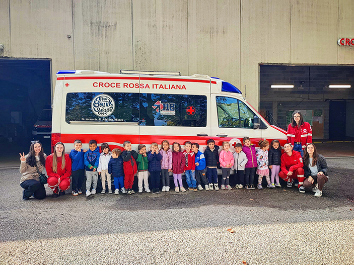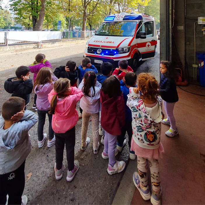 I bambini della sezione 4 anni, attenti e curiosi, hanno subito notato una presenza importante: la Croce Rossa Italiana, proprio lì, vicinissima a noi.