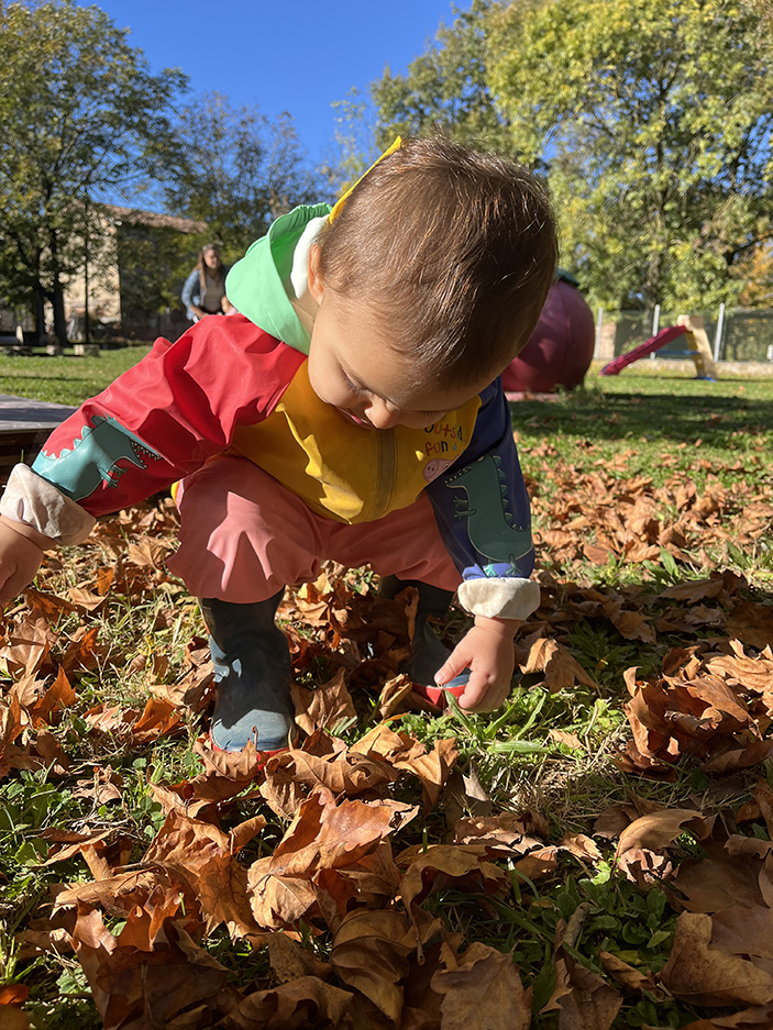 Nella prima esperienza i bambini hanno potuto toccare, osservare, odorare e manipolare da vicino foglie, piccoli rami e porzioni di corteccia. Il materiale naturale, disposto in modo accessibile, ha favorito la loro curiosità spontanea. C’è chi ha strofinato le foglie per ascoltarne il suono, chi ha confrontato le diverse consistenze e chi ha provato a impilare i rami come piccoli costruttori.