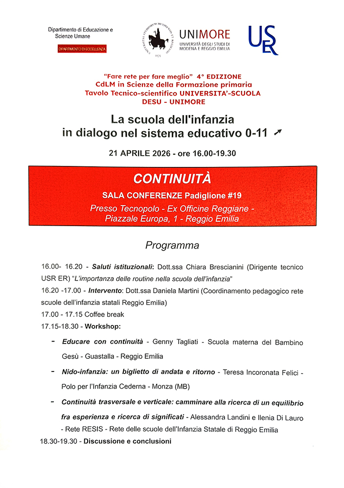Siamo lieti di segnalare l’intervento della nostra coordinatrice, Genny Tagliati, che prenderà parte al workshop con una relazione dal titolo: “Educare con continuità”