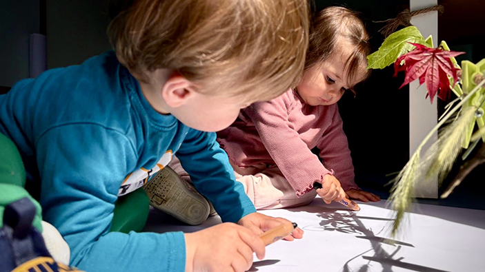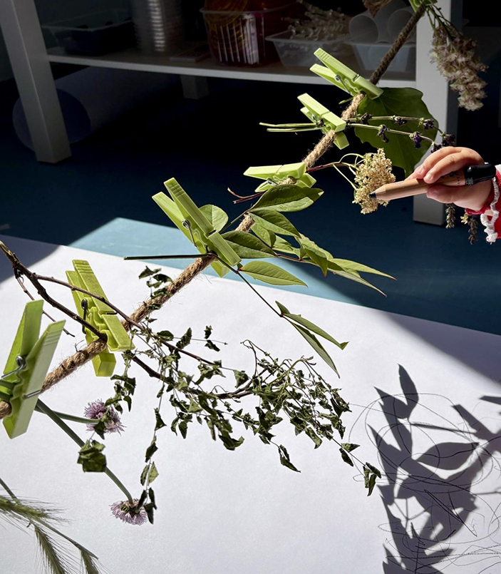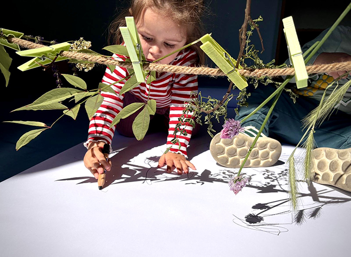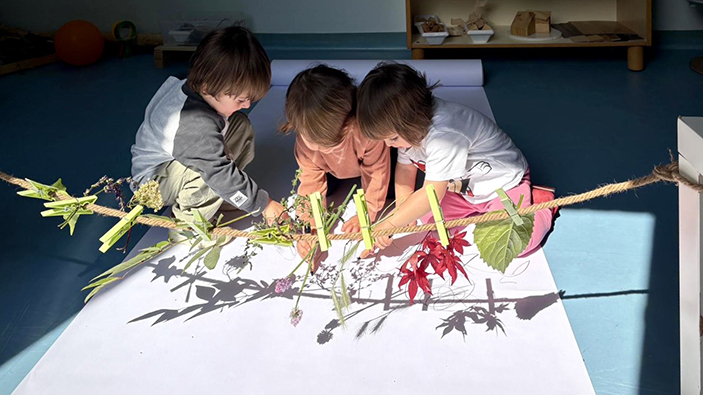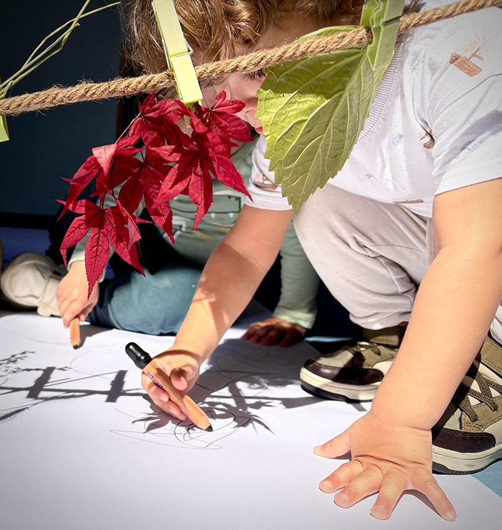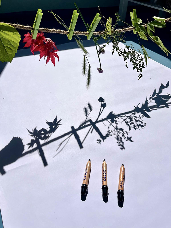 Dopo una passeggiata, durante la quale sono stati raccolti in natura elementi dalle forme diverse, questi sono stati appesi a uno spago davanti a una fonte di luce naturale. I bambini e le bambine hanno così potuto osservare le ombre proiettate e riprodurle su un foglio bianco utilizzando grossi pastelli neri, scelti per rimanere fedeli al colore delle ombre.