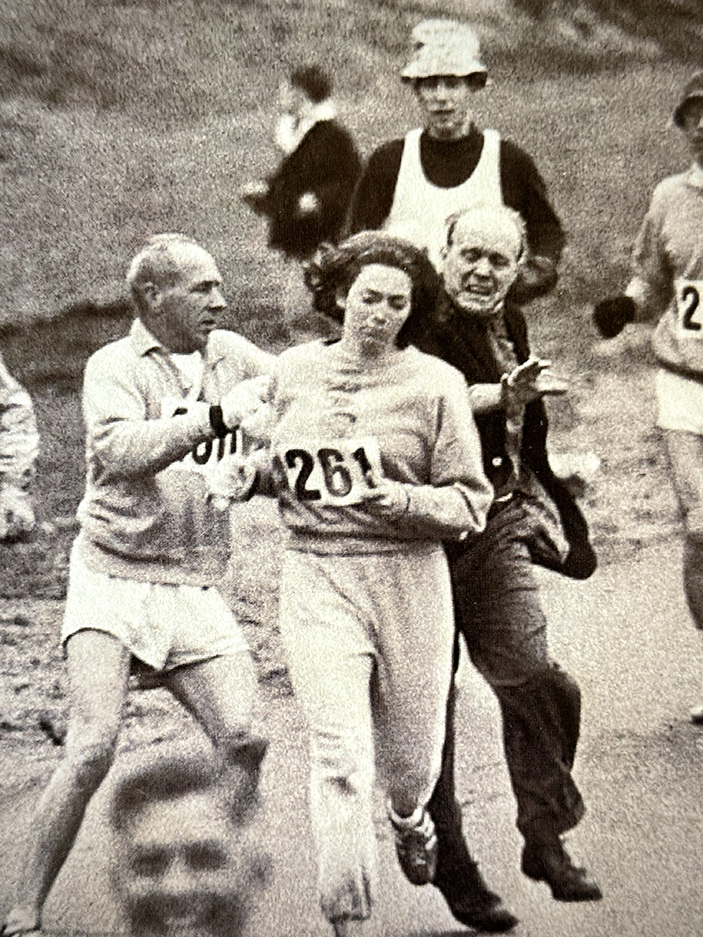 Dopo pochi chilometri, però, accade qualcosa di inaspettato: un organizzatore della gara tenta di fermarla e di strapparle il pettorale 261, gridandole di uscire dalla competizione.